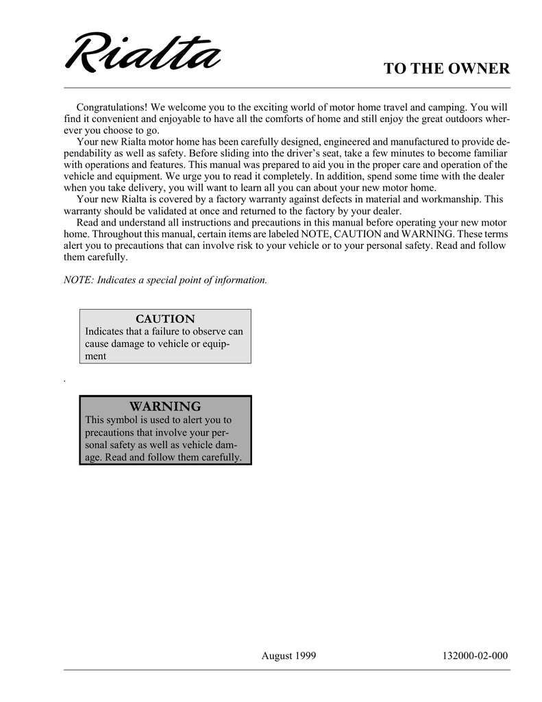 This manual is the same manual that the Winnebago dealers used to service and repair the Rialta. In addition to an extensive stock of original equipment parts Winnebago dealers have the training and experience to get. This information is provided as a convenience to Winnebago Industries motor home owners. Introducing our 2000 VW Rialta Winnebago. 2005 Rialta motorhomes pdf manual download. Guide Answer Key 2015 Rialta Owners Manual Repair Manual For Suzuki Boulevard 1500 C90 Jacuzzi Laser Sand Filter Manual 2015 Yamaha Fjr 1300 Motorcycle Service Manual Bmw R 1200 Gs Service Manual 2016 Service Manual.